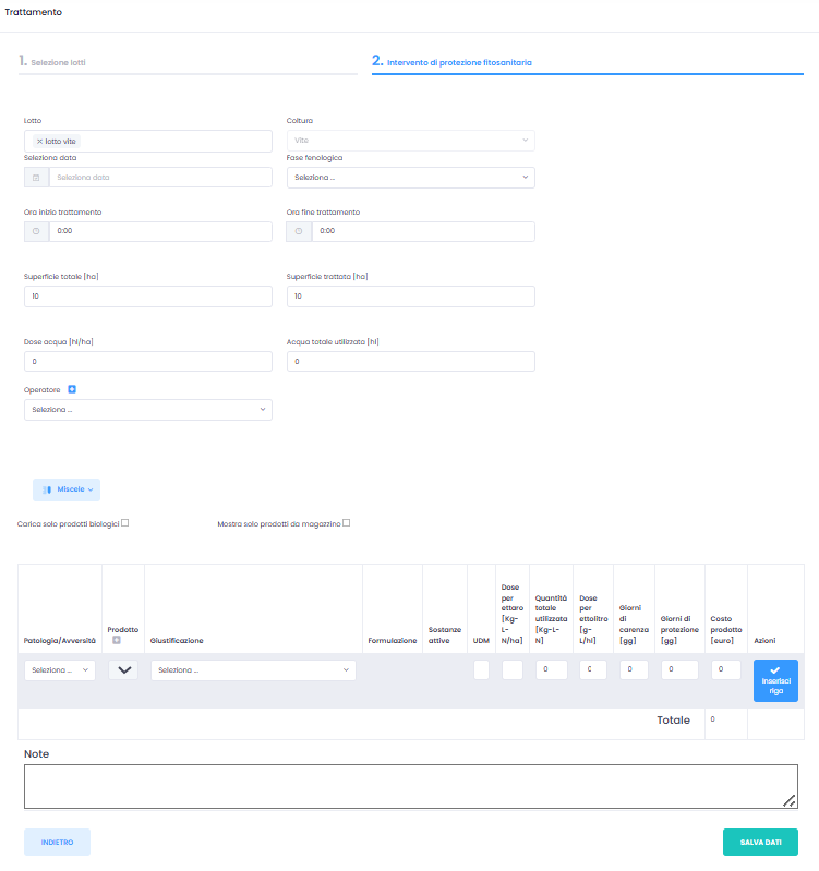 -**Date of treatment** and automatically the phenological phase is loaded, which you can edit;  -**Time of start and end of treatment**;                                                                                                        -**Area treated** in case it does not correspond to the total area of the plot (in case you have selected more than one plot, the area treated is not editable and corresponds to the sum of the areas of all the selected plots);                                                                                                                -**Dose of water** (hl/ha) i.e. the amount of water in the barrel;                                                                  -**Operator** either by selecting the drop-down menu with the names of the operators already entered, or by clicking on the “+” button and creating a new operator by entering the name, license number and expiration date of the license.you can upload the desired treatment. You indicate the date of the treatment, the start and end time of the treatment, the water dose (hl/ha) or the amount of water in the barrel, and the name of the operator.